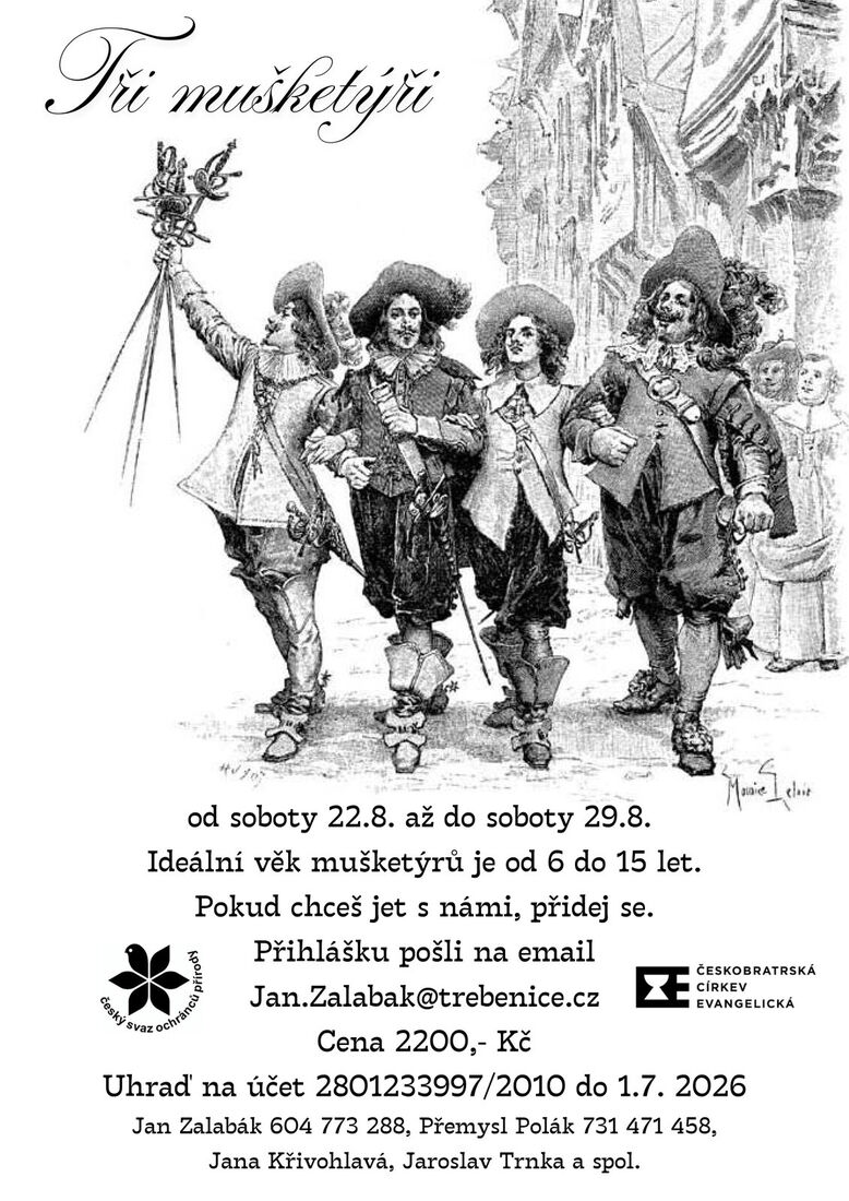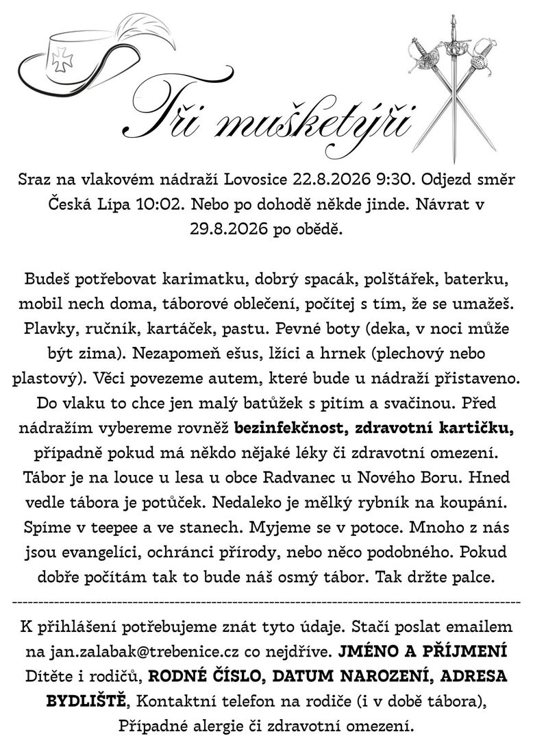 Přijedeme na louku u Nového Boru a na týden jí proměníme v naše bydlení. Myjeme se v potoce, plaveme v nedalekém rybníku, vaříme v polní kuchyni, spíme v tepee a ve stanech. Nejmladším dětem bývá 6 let, nejstarším 15 let. Jezdí s námi ale spousta odrostlých, co se už počítají za vedoucí. Budeme nadšení, když se nějaké dítě s Vašeho sboru k nám přidá.